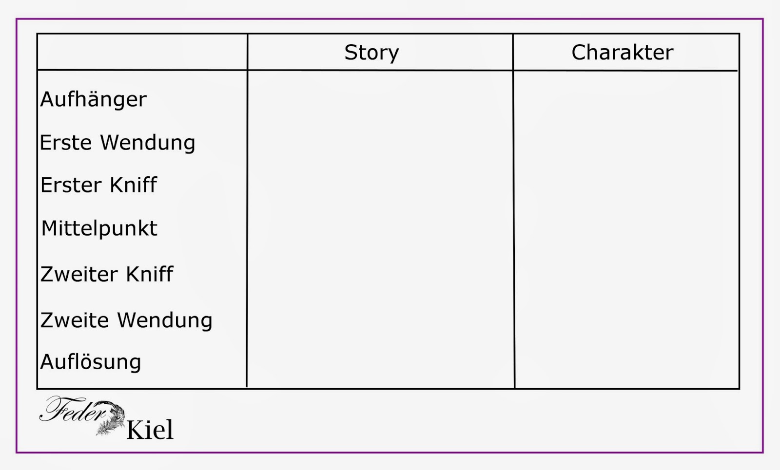 Ich empfehle es, nicht nur für die Hauptstory, sondern auch für alle Subplots eine Tabelle mit diesen sieben Punkten anzulegen. Also auch für die Entwicklung des Helden, für die Liebesgeschichte oder die Abenteuer des Nebencharakters.
